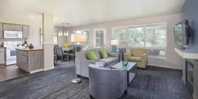 A little Wild West grandeur will do you good. WorldMark Eagle Crest offers spacious one-bedroom hotel suites and two-bedroom resort suites that comfortably sleep four to six guests. Resort suites feature one king bed in the master, one queen or two twin beds in the guest room and a queen sleeper sofa or Murphy bed in the living area. You will appreciate the privacy of separate bedrooms, the economy of a mini or fully equipped kitchen and a gas barbecue grill on the patio. Plus, a dining area (two-bedroom only), living area and TVs throughout are comforts that would be hard to find in an average hotel.